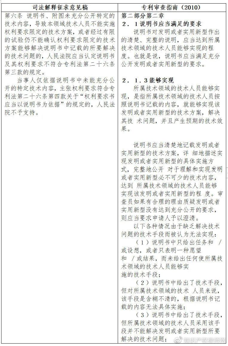“司法解释征求意见稿”第六条第一款是关于充分公开的规定。该款通过列举公开不充分的两种情形来规定何谓充分公开。相比之下,《审查指南》的规定则更为完备,不但规定了公开不充分的五种情形,还正面规定了何谓充分公开,规定了充分公开的三个要件:能够实现该发明或者实用新型的技术方案,解决其技术问题,并且产生预期的技术效果。