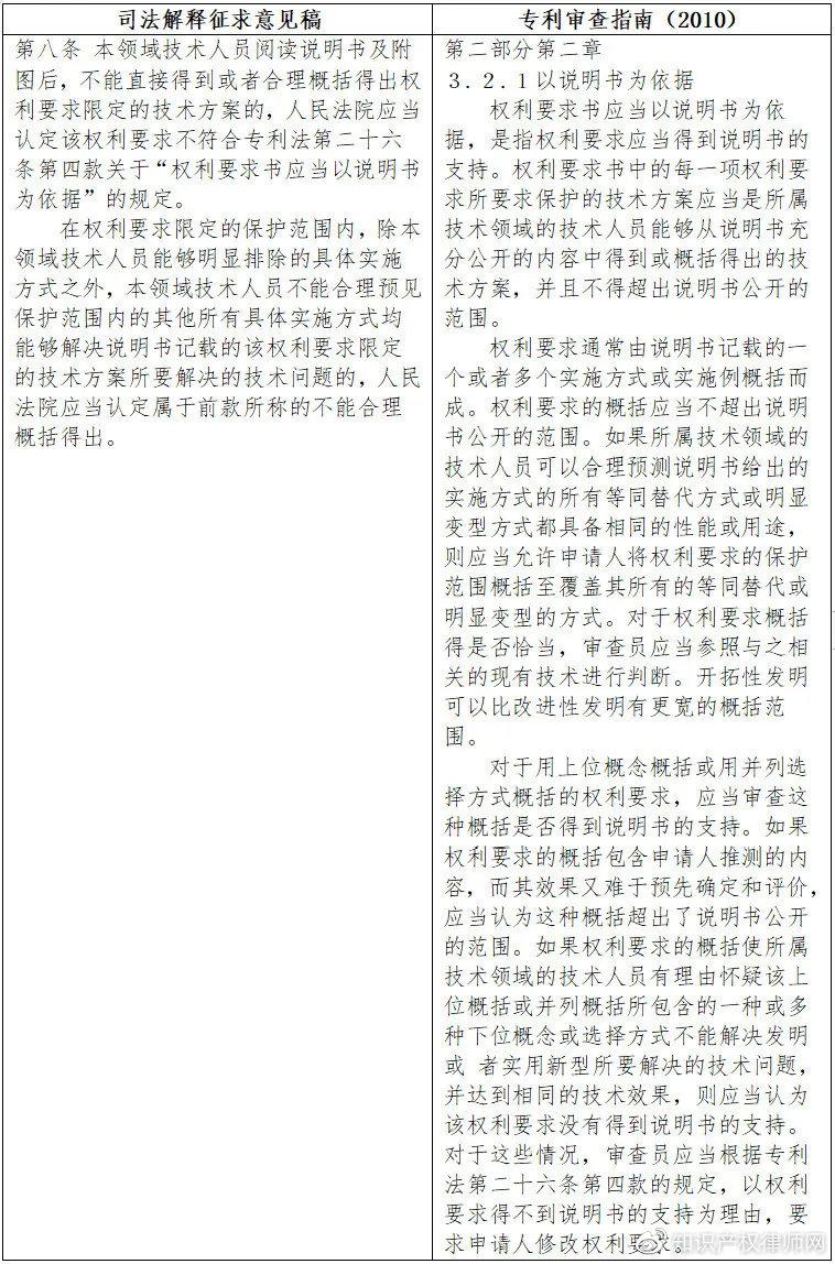 。虽然“司法解释征求意见稿”第六条第二款规定了“当事人仅依据说明书中未能充分公开的特定技术内容,主张权利要求符合专利法第二十六条第四款……,人民法院不予支持”,也弥补不了“司法解释征求意见稿”第八条第一款关于权利要求书应当得到说明书的支持的规定与《审查指南》相比残缺不全的缺陷。