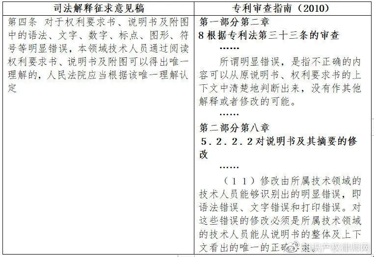 “司法解释征求意见稿”第四条是关于明显错误的的规定,该条与《审查指南》的相关规定,除了《审查指南》允许申请人对明显错误进行修改而“司法解释征求意见稿”并未允许修改之外,并无实质差异。但“司法解释征求意见稿”将“文字、数字”并列,将“标点、符号”并列,显得不严谨。因为数字也是文字,标点属于符号。