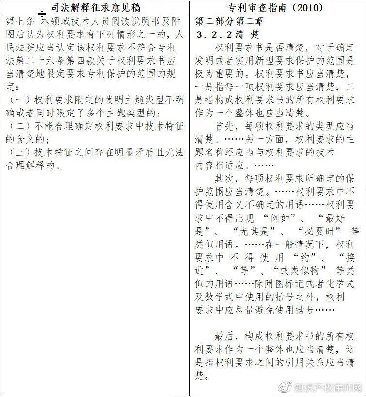 “司法解释征求意见稿”第七条是关于权利要求清楚的规定。“司法解释征求意见稿”将权利要求清楚的规定分散在第三条、第七条,显得体系凌乱。从表格中的对比可以看出,与《审查指南》的相关规定相比,“司法解释征求意见稿”第七条仅列举了权利要求书不清楚的三种情形,没有《审查指南》的规定完备。