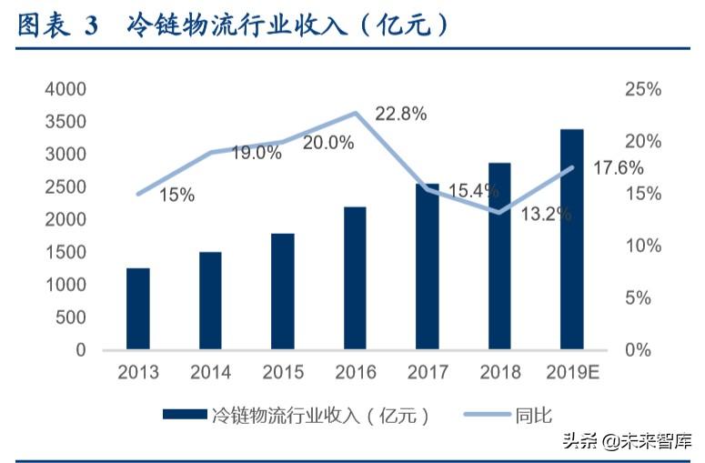 冷链物流行业收入 2018 年为 2886 亿,同比增长 13.2%,14-18 年复合增速 18%(社会物流费用同期复合增速为 6%)。