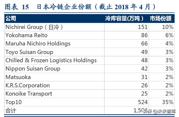 2018 年日本前十大冷链企业份额合计占比 35%,其中最大企业日冷集团占比 10%。按照 2019 年日冷集团数 据,205 万吨的容量,位居世界第五。