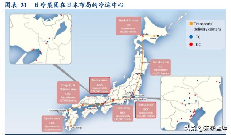 日冷在日本全国范围建成运营 7 大区域的冷库公司,75 个转运中心,总计 152 个物流中心。每天公司通过 4000 多 辆运输车,满足全国范围内 5000 多家门店的需求,从北海道到福冈地区,日冷都有其子公司和配送中心分布,充足 的冷藏、冷冻网络支撑使得公司业务遍布全国,形成冷链物流配送的规模效应。