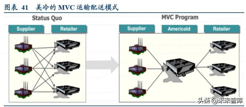 点对点配送转为中心中转运输,公司自建 MVC 运输配送系统,实现供应端与需求端在中心场地实现分配。对供应 商来说,可以减少运输开支,实现快速响应下游不同客户的需求。而对于需求方来说,减少了库存管理难度,加速 了周转效率。