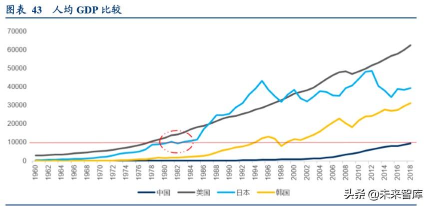 从人均 GDP 看,日本 1968 年从 1500 美元提升至 1995 年首次突破 4.3 万美元,处于快速增长期,尤其在 84 年到 95 年的十多年间,复合增速 13%。