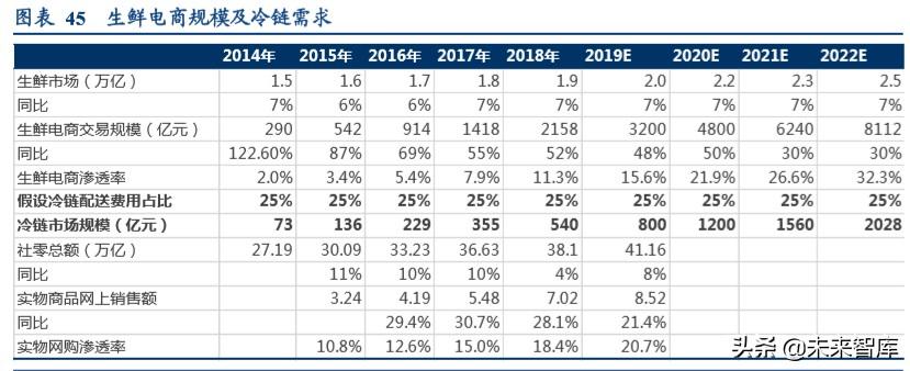 。2019 年生鲜电商规模预计 3200 亿,15-19 年复合增速超过 50%,我们预 计生鲜电商交易规模 2020 年或增速 50%,此后两年维持 30%增速,则 2022 年交易规模突破 8000 亿元,假设冷链配送费用占比 25%,则对冷链市场需求 将从 2019 年的 800 亿提升至 2022 年的 2000 亿左右,三年提升 1000 亿规模。