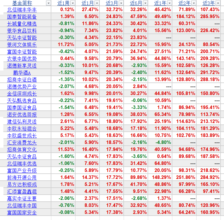 这些基金中,最近三月表现最好的是银华食品饮料,涨了23%,最低的也涨了17%。