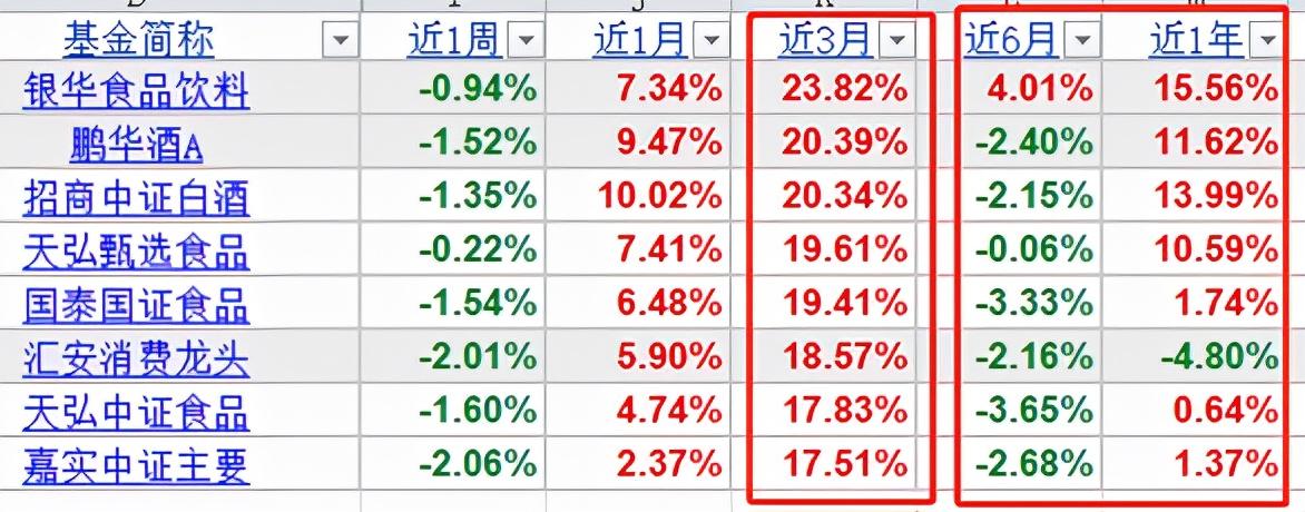大家发现没有,这些基金虽然最近三月涨的不错,但是它们过去表现不太好,最近三月大家都涨十几二十,但是最近六个月却只有银华食品饮料是正收益,最近一年以来,汇安消费龙头还是负收益,其他虽然是正收益但也不高。